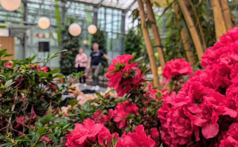 Unser "Konzertsaal" befindet sich im Japanischen Garten inmitten der Azaleensammlung. Diese Pflanzen mögen kühlere Temperaturen, sodass wir auch bei Veranstaltungen nicht heizen können. Warme Kleidung steigert deshalb das Konzertvergnügen.